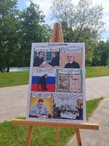 Ker je bila letos (2025) rdeča nit medvoškega kulturnega festivala, ki vsako leto povezuje dediščino, industrijo in sodobno umetnost v objemu narave, 180. obletnica rojstva Jakoba Aljaža, smo za sodelovanje pri pripravi knjižničnega prispevka na kulturnem festivalu prosili župnika Jensterla. Njegov strip smo razdelili na osem tematskih sklopov. Oblikovali smo osem plakatov, ki z odlomki iz stripa predstavijo Aljaža duhovnika, glasbenika, ljudskega tribuna, pionirja slovenskega planinstva, graditelja triglavskih planinskih postojank in urbanista doline Vrat ter konec koncev tudi neverjetno tehnično nadarjenega človeka. Plakate smo s kratkimi pojasnili razstavili na tematski festivalski krožni poti KULtura s postajo v Aleji Medvoščanov, ki je med knjižnico in reko Savo. Tematsko krožno pot je prehodilo prek 400 osnovnošolcev in okoli 50 odraslih in prav vsi so se zadržali na razstavi stripa in tako spoznavali podrobnosti iz življenja občinskega zavetnika Jakoba Aljaža.