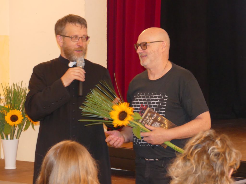 Po maši pa smo bili povabljeni na ogled animiranega dokumentarnega filma o sv. Urhu in župniji Smlednik. Avtor scenarija je župnik, k sodelovanju pa je poleg grafičnega oblikovalca Juana Juvančiča povabil še nekaj faranov: dve odrasli za lepšo slovenščino in dva otroka, brata in sestro, ki poleg župnika bereta besedilo filma. Za župnika je bil to nekako peti takšen projekt, vse je delal z grafičnim oblikovalcem in avtorjem risank Juanom Juvančičem, po domače Janezom Juvančičem, ki je pred 15 leti je prišel iz Argentine v Slovenijo. Pustil je vse in prišel, ker se v Sloveniji počuti bolje kot v Argentini in ker je Slovenija tako zelo lepa. O tem je pripovedoval tako nam na prireditvi kot v pogovoru, objavljenem na spletni strani Socialne akademije https://socialna-akademija.si/juan-juvancic-in-moras-se-zabavat-ker-en-nasmeh-naredi-boljse-zivljenje/.
